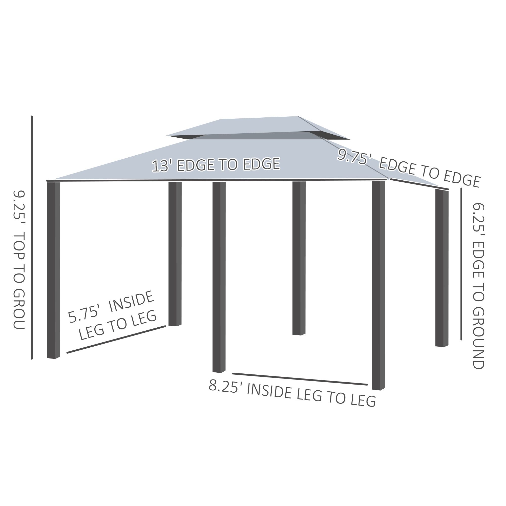 5.- Wide Canopy Gazebo Information: Overall Dimensions: 9.75' L x 13' W x 8.75' H. Edge Height: 6.5' H. Space Between Columns: 5.73' L x 8.38' W. Includes 12 support stakes for mounting to soft ground. Note: Store away the canopy top during adverse weather or inclement weather conditions which includes rain, snow, sleet and hail as they will add weight that can cause the gazebo to collapse..