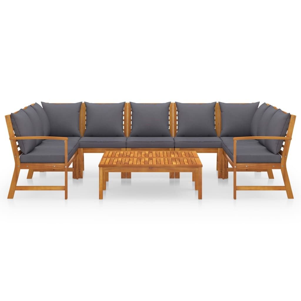Check out this 9-piece garden lounge set! Made from solid acacia wood with an oil finish, it fits perfectly into any outdoor space. Designed for summer chillin' and hangouts, it has a modern style that makes your balcony or patio feel welcoming for gatherings or just relaxing.