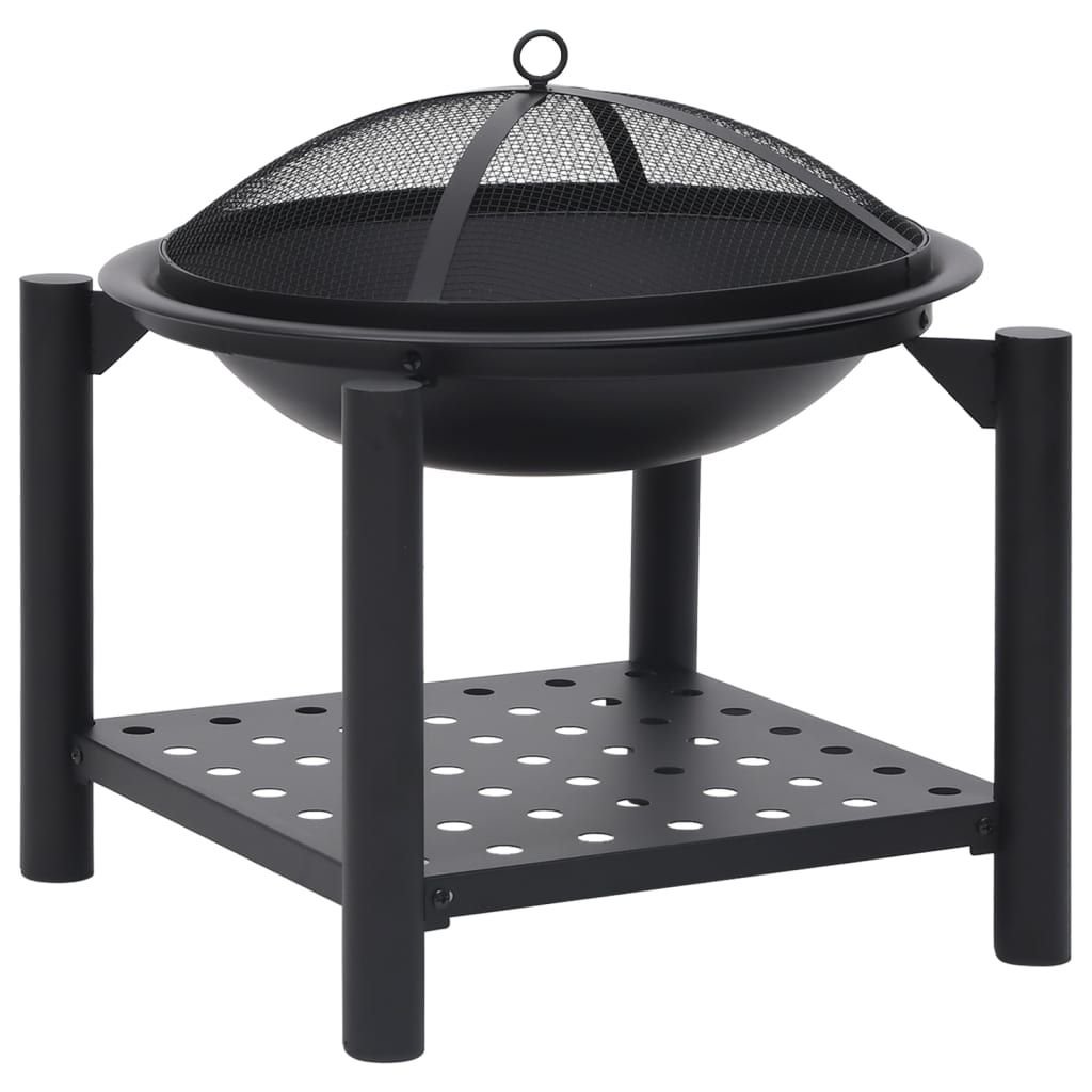 Made of steel, the fire pit is excellent in absorbing and radiating heat. Featuring a large bowl, this fireplace allows for a large fire for you and your family to enjoy for hours. The mesh allows you to watch the burning fire, and encloses the fire for safety as well as preventing sparks and debris from flying out. Additionally, there is a convenient ring in the mesh cover so that you can carry it easily. The included poker can be used for both removing the mesh cover and rearranging the logs. What's more, the shelf provides additional storage space to put more firewood.
