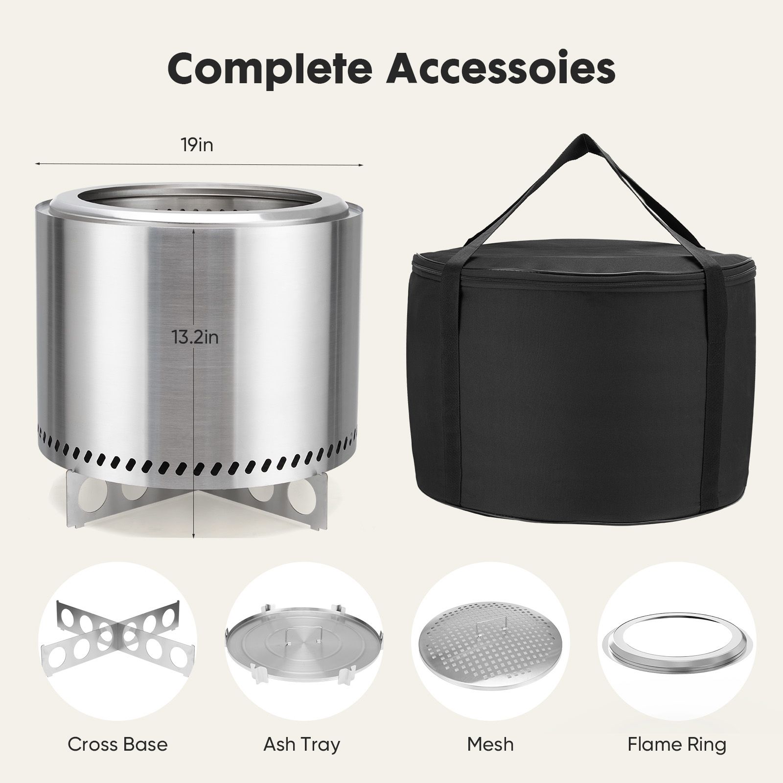 Whats Include: 1x Large outdoor firpit with stand and carry bag. size (HxW): 19" x 19", Weight: 22.44lbs, Color: Sliver. Include ash tray, mesh, flame ring. Easy to use and just enjoy your warmer outdoor life!