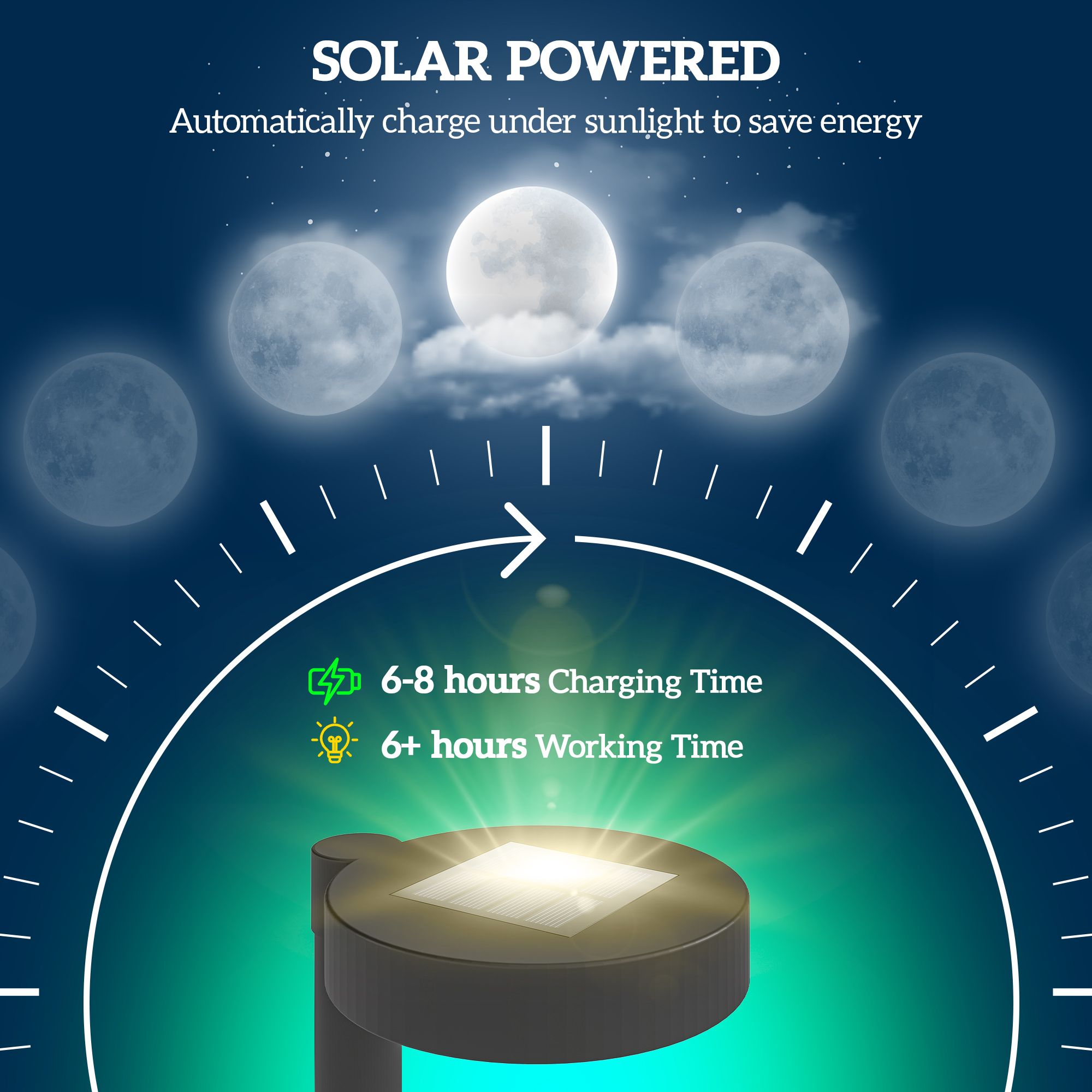 • Efficient Energy Use: These solar lights provide 6+ hours of illumination after charging for 6-8 hours in full sunlight. With the "on" mode activated, they automatically turn on at dusk and off at dawn for effortless operation.