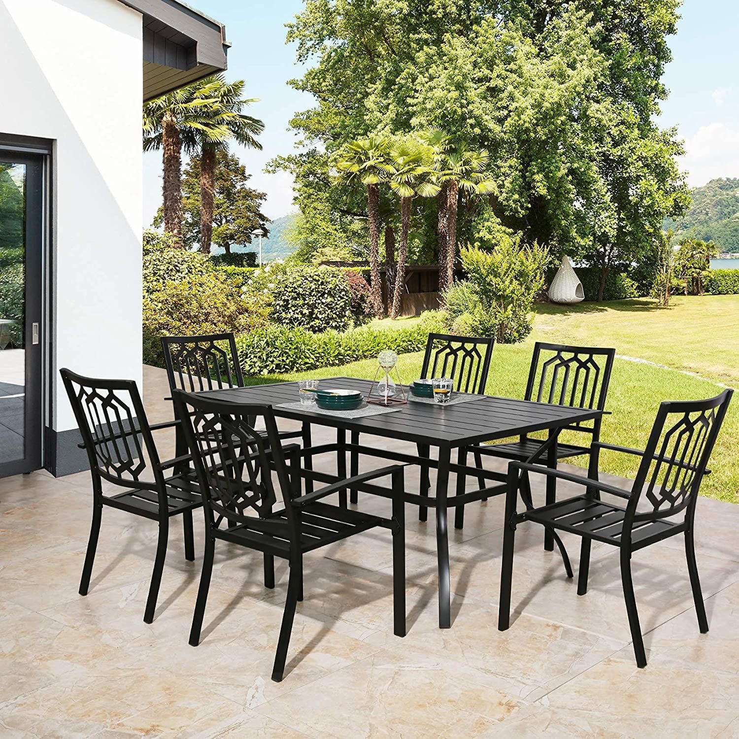 3.Large Dining Table: Slat steel tabletop design makes your outdoor furniture more eye-catching; The dining table is suitable for six or more person family dinner and party