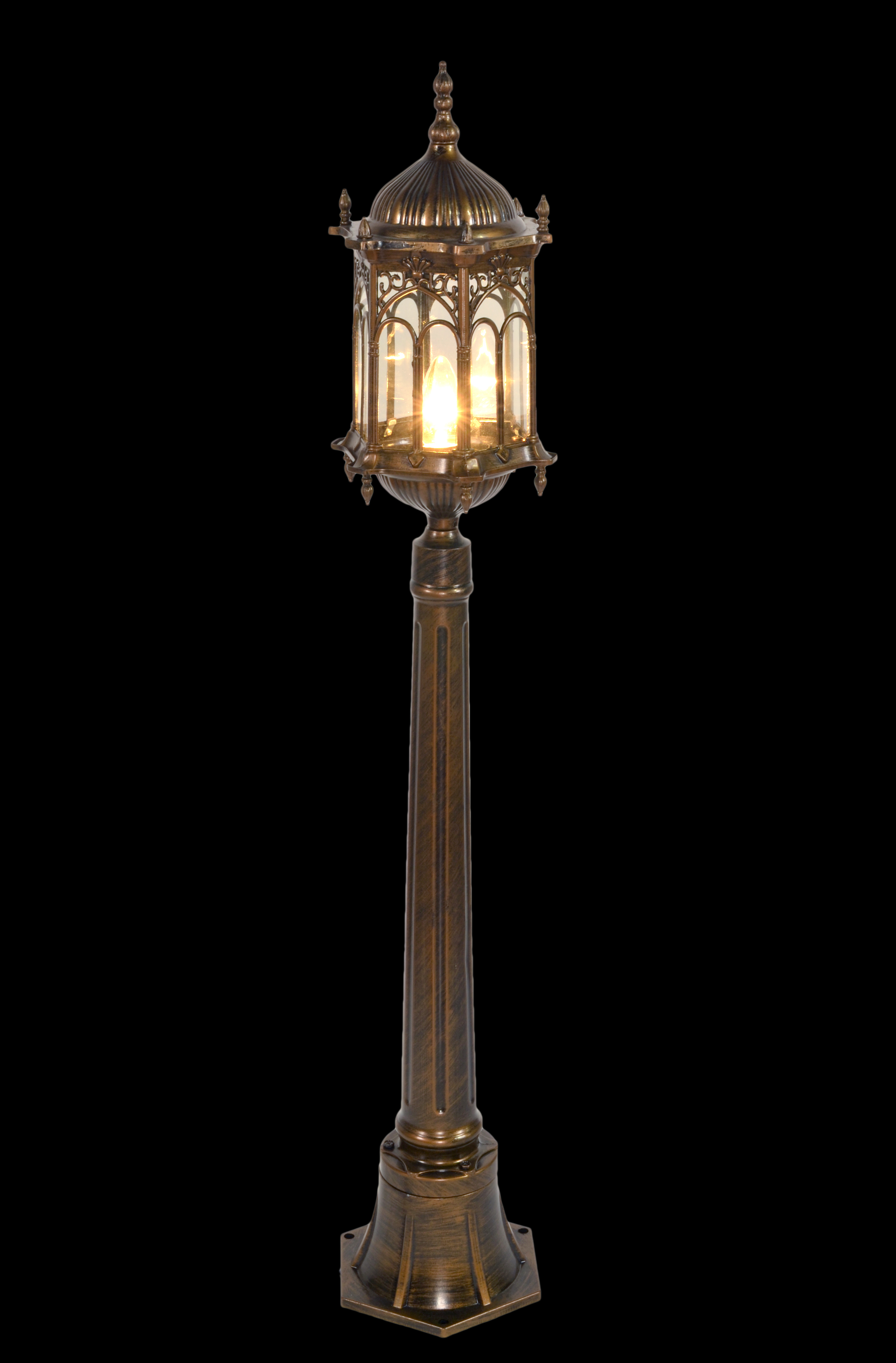 The Gothic Grassland Lamp shows style and elegance in medieval architecture. Featuring a rust proof cast aluminum composition with fantastic details of spires scrolls and archways surrounding the glass light enclosure. Pre-wired for ease of installation. Main electrical wiring is necessary.