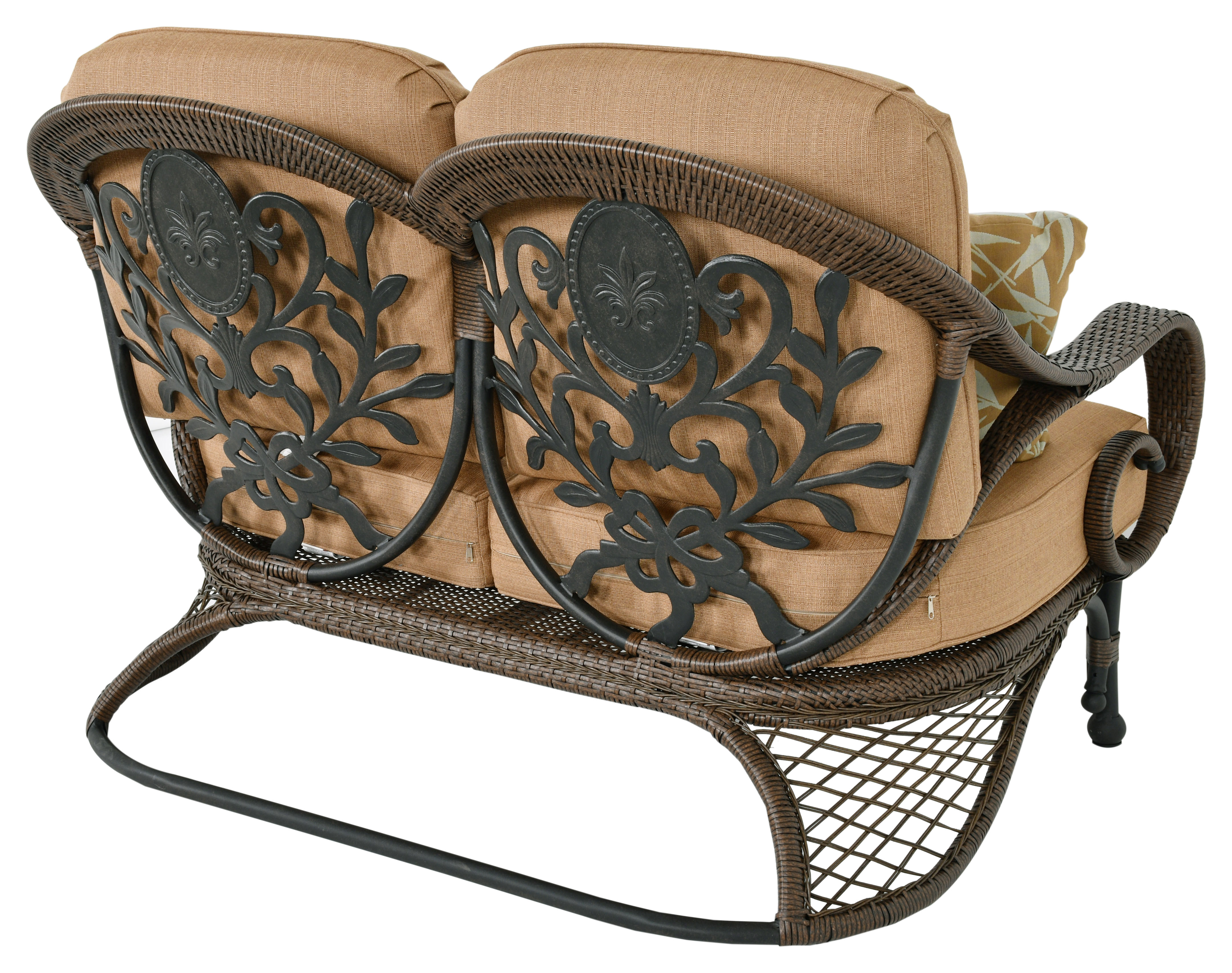 Bridgeton Moore presents the Grand Bonaire Weave Loveseat at 54 inch wide, from our fashionable Grand Bonaire Weave Collection. A very comfortable, deeper seating loveseat with plush seat and back cushions with contrasting accent pillows. The collection's designers captured the emerging trend, popular in high end outdoor furniture, of bringing interior fashions outdoors. To create this exclusive and very beautiful collection the designers combined a beautiful cast aluminum design and softened it by adding intricate hand weaving. The design features scrolling elements finished in a brown bronzed tone with hand highlights that accentuate the details, then a multistep powder coat finish is applied that enables a longer lasting outdoor finish. The Grand Bonaire Weave Collection is a large collection, this Grand Bonaire Weave Loveseat pairs perfectly with the Grand Bonaire Weave Club Chairs and Ottomans. The collection offers many other accompanying items enabling you to expand and create your entire outdoor area. You will never find screws used in a Bridgeton Moore Seat, the loveseat is a fully constructed 100% aluminum frame, meaning it is fully welded prior to finishing, the best process to insure long lasting heavy duty stability that will never rust. The chair design is further enhanced by delicate hand weaving in all-weather natural looking synthetic polyethylene. No Assembly is Required. The cushions are special quick drying foam and covered in a soft beige linen Sumbrella Brand fabric with a designer selected accent pillow also in Sumbrella fabric, considered amongst the best fabrics for long lasting outdoor use in the industry. Bridgeton Moore has established high brand quality standards and offers one of the best warranties in the Industry, 3 years on all frames and finish under normal conditions, fabrics are all Sumbrella grade and come with a manufacturers supplied two years against any manufacturing defects and or fading from date of purchase. Note * All products used outdoors require reasonable care and that level of care depends on varying external conditions. Covers are recommended for year round outdoor exposure and especially for all coastal applications. Extended exposure in coastal areas can cause corrosion and while this product is used in many coastal applications, they are voided from warranty. Simple hosing down or rinsing off salt exposure if/any will protect and extend the beautiful finish. The fabrics can be easily cleaned in a variety of ways and Sumbrella fabrics are so colorfast they can withstand even the use of bleach. No Assembly Required