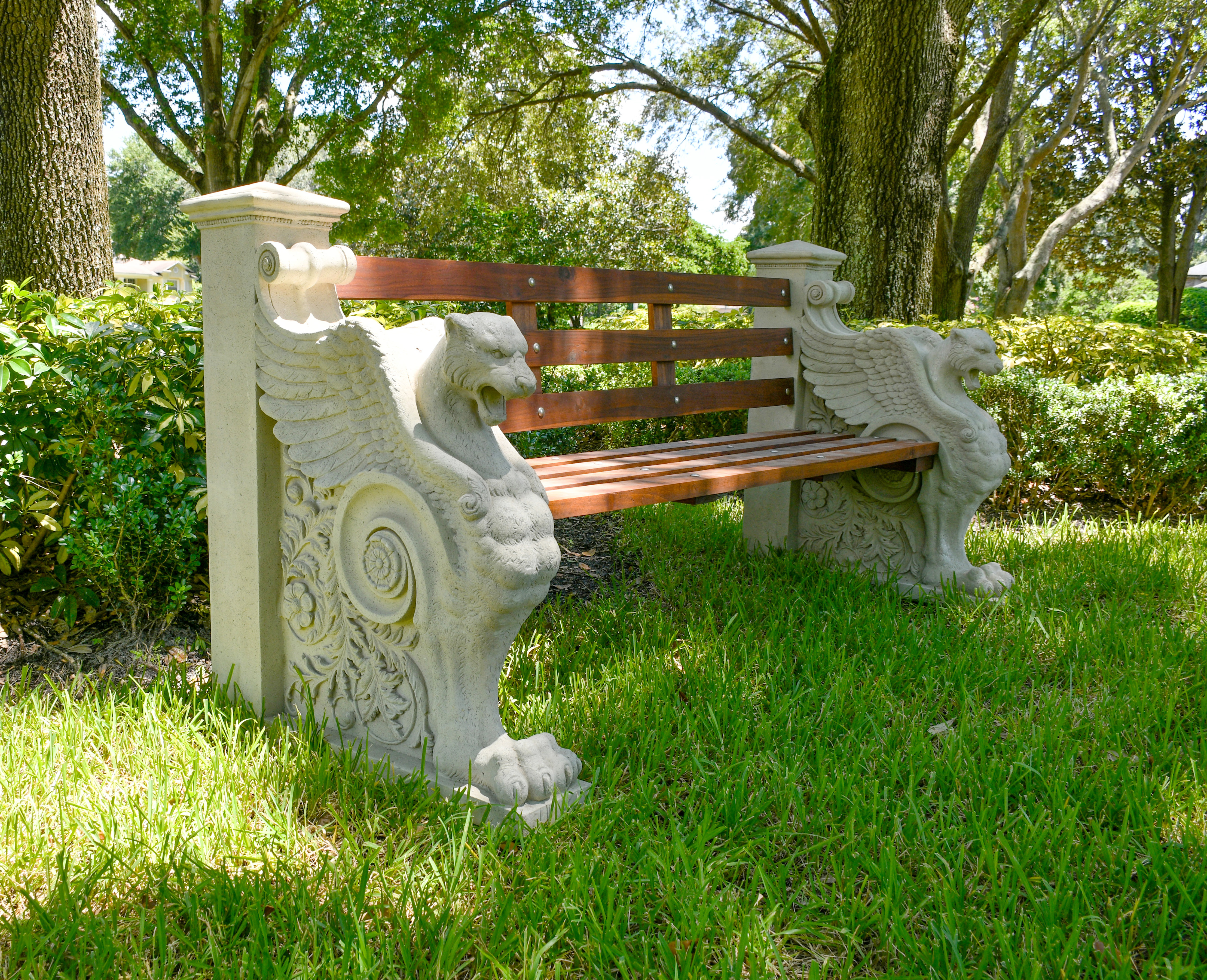An incredible seating solution for any home or business the Charlottenburg Bench features incredible detail in its stone cast legs portraying winged lions and teak wood slats. Durable enough for commercial applications this bench will be a fixture of your garden or backyard.