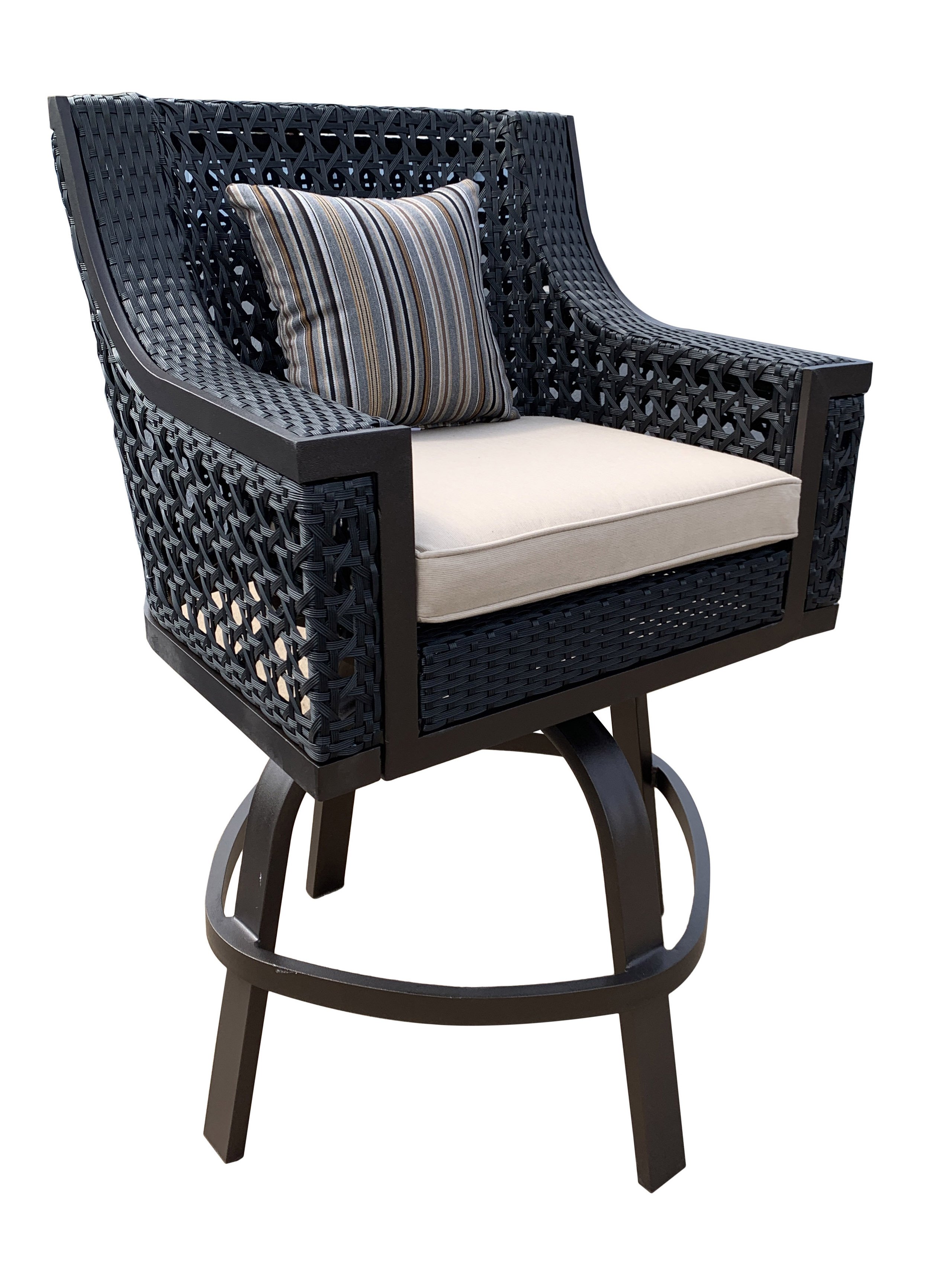 The Monterey Swivel Bar Pub Stool from Bridgeton Moore is a stylish addition to any outdoor bar setting. Featuring spacious seating, this bar stool offers enhanced comfort, making it a popular choice for any outdoor bar area. Sold separately, it pairs perfectly with the matching Monterey Bar Table for a cohesive look. The Monterey Collection is designed to seamlessly bring interior styling to your outdoor space. Accentuated by hand-woven UV and Split Resistant Poly weave. The poly weave construction accommodates expansion and contraction in various climates, preventing cracking and splitting. The cushions feature special quick-drying cores and upholstered in Sunbrella Brand fabric, renowned for its longevity and resilience in outdoor settings. Sunbrella fabrics are colorfast and UV resistant, ensuring lasting beauty without fading. Even bleach won't harm the cushion covers, which can be easily removed and washed. The Monterey Collection offers a variety of patio furniture to complete any outdoor project, from dining to seating arrangements. Backed by Bridgeton Moore's commitment to quality, the Swivel Pub Chair comes with an industry-leading warranty of 3 years on all frames and finishes under normal conditions. For year-round outdoor exposure, we recommend using covers and regularly cleaning the furniture surface to protect the finish. Experience the perfect blend of functionality, elegance, and comfort, creating unforgettable moments with family and friends in your outdoor oasis.