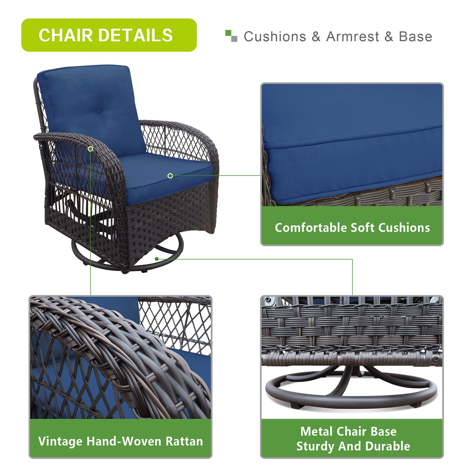 Wicker Swivel Rocker Chairs Sets; full 360-degree swivel to change direction easily; allows you to take better care of your children and to have face-to-face conversations with lovers and friends; a good partner for you to kill your time or rest. Durable steel frame; adopt more meticulous steel frame; more robust construction than others which finished by wicker. Well-made hand-woven rattan; tight and firm; UV resistant; not easy to fade and crack; to increase the service life. Great construction contains fun and comfortable addition to your indoor and outdoor space.