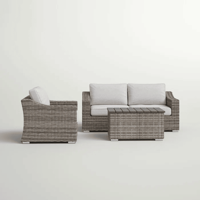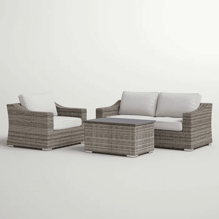 Create the perfect outdoor oasis with this stylish 3-piece patio seating group, designed for comfortable gatherings with family and friends in your backyard or on your porch. This set includes a cozy club chair, a spacious loveseat, and a chic coffee table featuring a slatted tabletop, all crafted with a sturdy aluminum inner frame wrapped in handwoven wicker rattan.Features:Comfortable Seating: Multiple gray olefin cushions filled with foam provide just the right amount of support for relaxing moments.Easy Maintenance: Removable cushion covers allow for hassle-free cleaning; simply unzip and toss them into the washing machine when needed.Weather-Resistant Design: Crafted with handwoven, weather-resistant wicker, this seating group can withstand the elements, ensuring durability and longevity.What's Included:6 Cushions1 Coffee Table1 Loveseat1 Club ChairWeights & Dimensions:Table Dimensions: 18" H x 33" L x 22" DChair Dimensions: 26" H x 33" W x 33" DLoveseat Dimensions: 26" H x 66" WCushion Dimensions: 5" H x 28" D x 28" WOverall Product Weight: 113 lb.Individual Chair Weight: 31 lb.Table Weight: 20 lb.Seat Height (Chair): 18" HSpecifications:Total Number of Pieces Included: 4Seating Capacity: 3Cushion Durability: Water and UV resistant for year-round useUpholstery Material: Polypropylene/OlefinCushion Fill Material: Foam (Open Cell Foam, 1.6 lbs./cu. ft.)Chair Weight Capacity: 300 lb.Country of Origin: ChinaAssembly Required: NoThis Rattan Wicker Fully Assembled 3-Person Seating Group combines comfort and style, making it the ideal choice for outdoor relaxation and entertaining. Enjoy the outdoors in luxury!