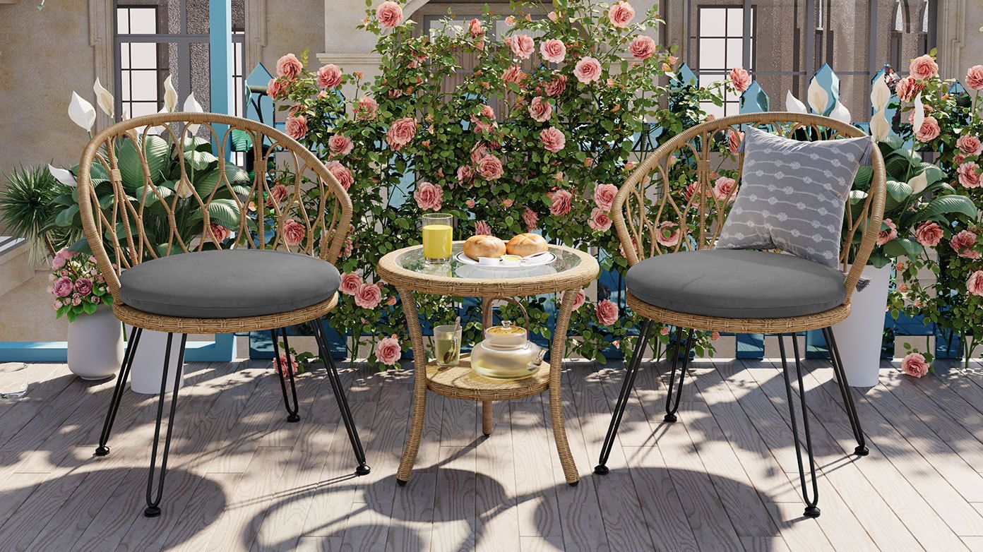 [Comfortable and Durable]: Crafted with an iron frame and reinforced anti-rust technology, this set withstands harsh weather. The premium PE rattan features a smooth surface, offering flexibility, breathability, and lasting comfort—perfect for long-term outdoor use.